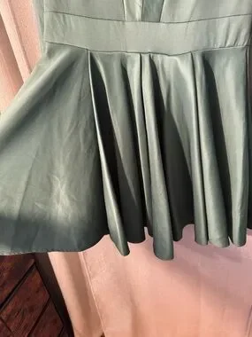 Chic olive green V-neck dress with a wrap-style bodice. Long sleeves and a defined waistband. Full A-line skirt for graceful movement. Smooth, slightly lustrous fabric for dressy looks.