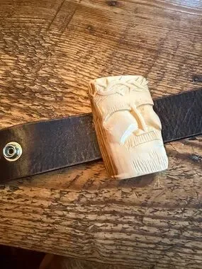 mounted on a blbelt. Eye-catching tribal-inspired design that adds character to any outfit. Easy to wear and pairs well with casual and rugged styles. Includes ivory color detail and black leather band.