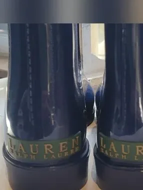 Sleek Chelsea-style rain boots in a glossy navy finish. Pull tabs at the back for easy on and off. Smooth, waterproof exterior with a polished shine. Versatile and stylish for wet weather. Logo on back heel with classic Ralph Lauren contrasting green.