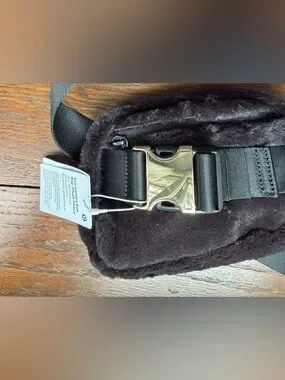 Plush black faux-fur exterior. Adjustable black webbing strap. Shiny gold-tone buckle closure. Subtle lululemon tag detail.