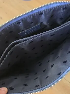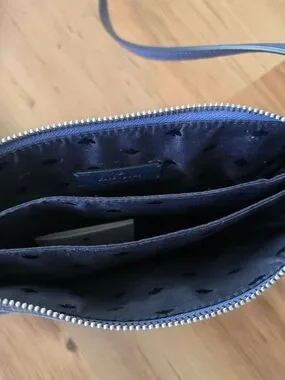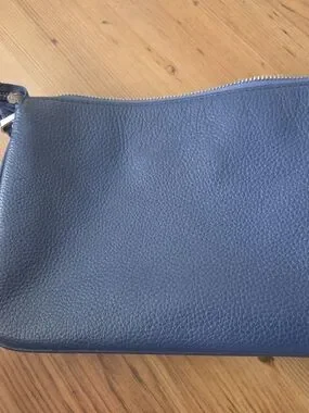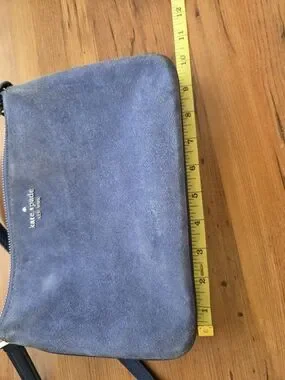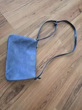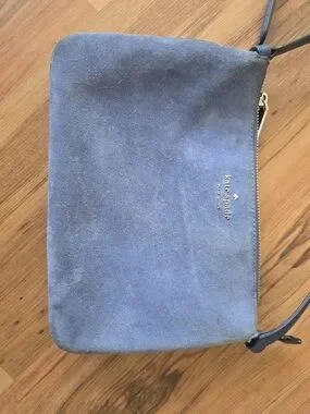 Soft blue suede crossbody with adjustable leather strap. Gold logo hardware at front. Simple, elegant silhouette. Perfect for everyday wear.