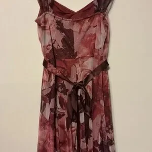 Elegant burgundy floral maxi dress with a romantic rose print. Lightweight sleeveless design with a defined waist for a flattering silhouette. Ideal for evening events and special occasions. Burgundy tones add warm, feminine appeal.