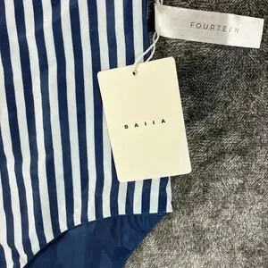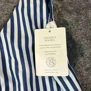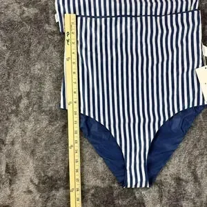 Chic one-shoulder swimsuit with navy and white stripes. Offers a flattering, streamlined fit and secure coverage. Soft, stretch fabric for comfort and easy wear. Stylish navy contrast panels accent the design.