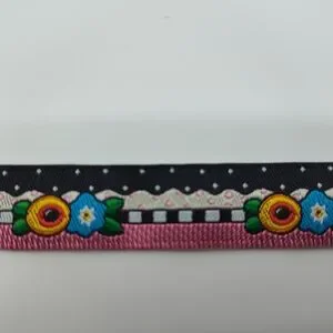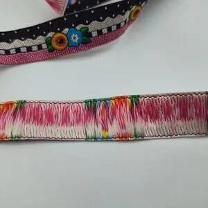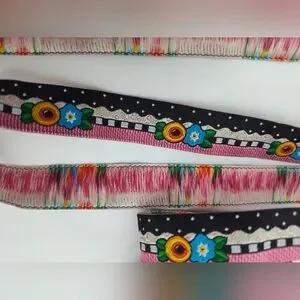 This folk art floral ribbon features bold black and pink graphic detailing with colorful embroidered-style flowers on the front, paired with a striking multicolor painterly fringe-style backing on the reverse. The contrast between the structured front and expressive back makes this a versatile, high-impact ribbon for luxury gift wrapping, sewing, crafting, and decorative projects.