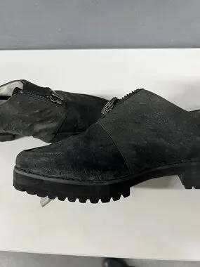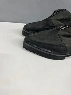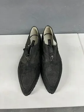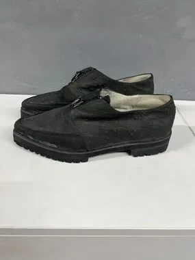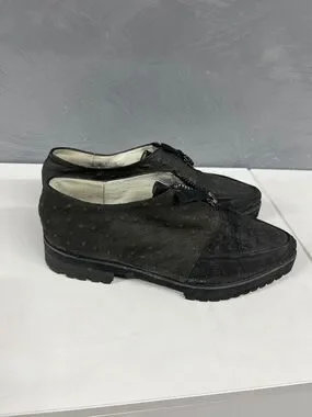 Classic black ostrich loafers with a front zip closure. Soft cushioned lining for comfort. Low-profile rubber sole for traction. Sleek silhouette works for casual or dress looks.