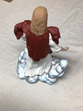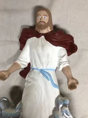 White and Maroon Ceramic Religious Figurine with Blue Accents