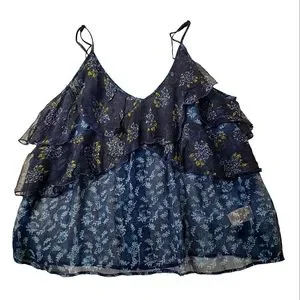 Free People Sheer Viscose Ruffles Button Back Cami Tank Dark Floral Coastal Top