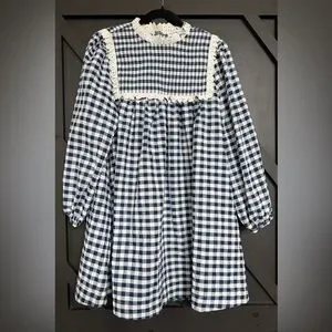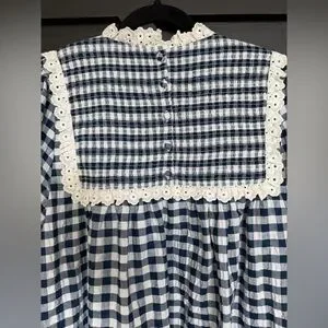 Charming and effortlessly feminine, the Carlyle Dress by Hunter Bell features a classic navy and white gingham print with beautiful vintage-inspired details. The smocked yoke is framed with delicate lace trim, giving it a romantic, heirloom feel, while the relaxed mini silhouette keeps it easy and wearable.