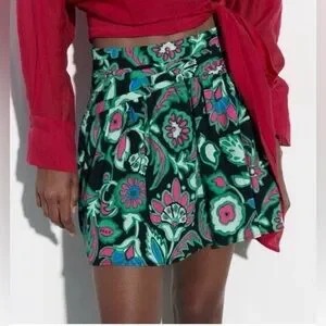 This stylish Zara mini skirt features a skater silhouette, perfect for resort wear. The vibrant pink and blue floral pattern stands out beautifully against the dark background, adding a lively touch to your casual wardrobe. Its flared design offers a playful and breezy feel, ideal for sunny getaways.
