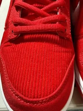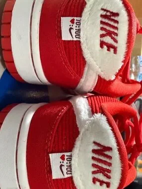 Vibrant red Nike low-top sneakers. Heart logo on each tongue. White Swoosh and midsole accents. Lace-up design for daily wear. Casual and sporty look. Fits more like 8.5