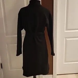 Classic black wrap dress with a self-tie belt. Soft, streamlined silhouette that flatters the figure. Versatile for day or evening wear. Easy to style and comfortable for all-day wear. F and E can run small and this is a wrap dress, it is size XL but fits like L according to my previous F and E purchases and consumer reviews.