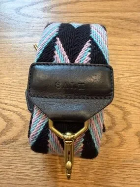 Stylish black strap with pink, blue & purple chevron accents. Durable woven construction for comfortable wear. Leather-trimmed ends and brass hardware for secure attachment. Versatile for bags or crossbody use. Easy to install and adds a bold, modern look.