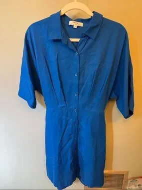 Cobalt blue shirt dress with a button-front closure. Short sleeves and tailored seams create shape. Lightweight, drapey fabric for easy wear. Versatile, polished everyday style.