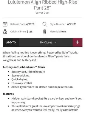 ![[LIKE NEW] $118 LULULEMON Align Ribbed High-Rise Pant 28" in Velvet Dust. Size 4 - Picture 2 of 9](https://di2ponv0v5otw.cloudfront.net/posts/2026/04/04/69d185fcfe4c68c4b04c0b94/m_wp_69d186093509d1cae8c5ec97.webp)