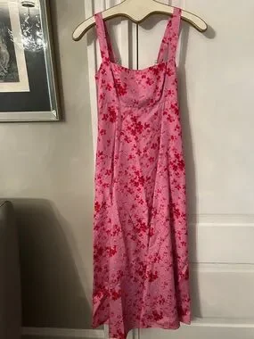 This dress is so gorgeous. The material is a heavier silky feel. Has pockets. Elasticized back. Ptp length 13. 44 length from armpit. Worn once and in perfect condition.