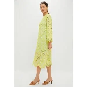 Bright eyelet midi dress with scalloped hem. Long sleeves with subtle flare. Round neckline and full lining. Breezy, feminine silhouette ideal for daytime events.