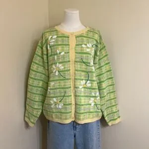Talbots Vintage Green Plaid Daisy Embroidered Cardigan Sweater XL Ramie Cotton