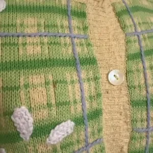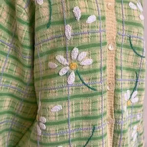 Vintage-inspired Talbots cardigan features a charming green and yellow plaid pattern accented by embroidered white daisies. B100