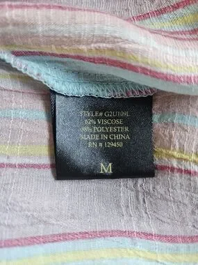 Lightweight, easy-to-wear blouse with soft pastel stripes and a relaxed, flowy fit. Perfect for spring/summer styling — pairs effortlessly with denim, shorts, or layered for a coastal vibe.