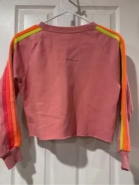 A casual cropped sweatshirt in soft pink with 5 neon stripe detailing on the sleeves. Features a bright yellow lightning bolt accent for a playful look. Comfortable, lightweight fabric with a relaxed fit for everyday wear. Fits a small easy. I can wear as a medium as not an oversized fit