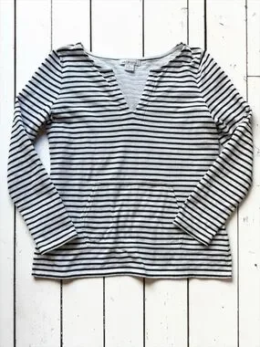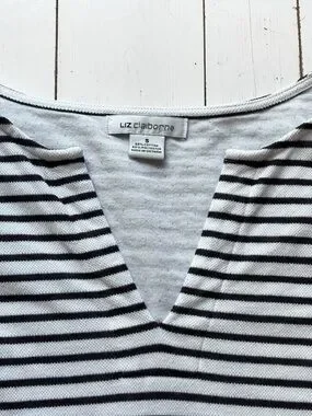 Liz Claiborne Black White Striped Knit Tunic Top Small V Neck Pullover Pocket
