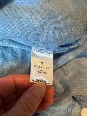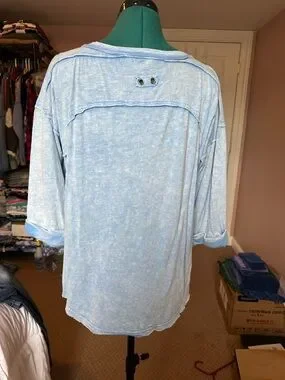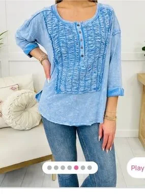 Washed light blue long-sleeve henley with ruched front panel. Button placket at center front. Soft, relaxed silhouette for casual wear. Three-quarter sleeves with rolled cuffs.