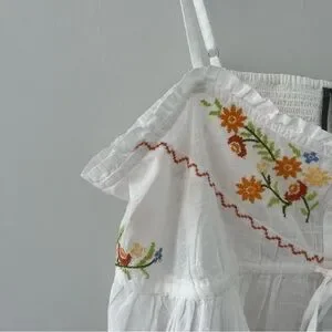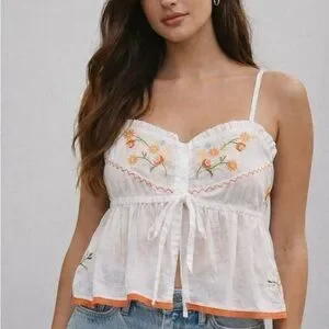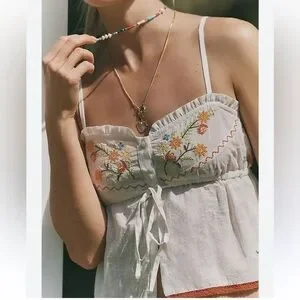 Beautiful By Anthropologie embroidered flyaway cami. Crafted from 100% cotton with delicate floral embroidery across the bodice, adjustable straps, and a soft smocked back for a comfortable fit.