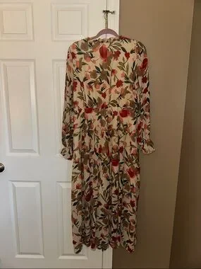 Lightweight cream midi dress with a vibrant red and green floral print. V-neckline and elastic waist for a flattering silhouette. Long sheer sleeves with gentle ruffle cuffs for a feminine touch. Soft, flowy fabric ideal for day-to-night wear. Lined. Worn once. Smoke free home.