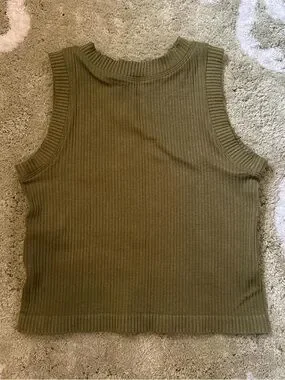 Soft ribbed sleeveless knit top in olive. Comfortable stretch fabric with a classic crew neckline. Versatile layering piece for casual and elevated looks. Designed in a flattering cropped length.