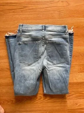 Slim skinny jeans in light wash denim. Distressed knee details and frayed hems. Classic five-pocket styling with belt loops. Stretch fabric for comfortable fit.