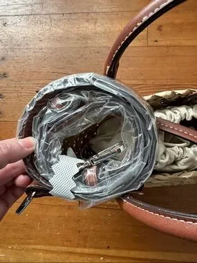 This is a smaller tote size, with a crossbody strap. See photos for details re: composition.