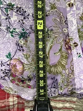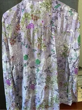 Lightweight button-front blouse by Pilcro. Lavender base with floral print in green, pink, and cream. Long sleeves and a relaxed fit. Soft, drapey fabric with delicate patterning. Versatile for casual or dressed-up looks.