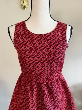 Classic sleeveless fit-and-flare dress, sold in Anthropologie, in a red and black geometric pattern. Tailored waist and full skirt create a flattering silhouette. Lightweight, structured fabric holds shape for polished wear. Ideal for daytime events or evening outings. Includes red and black colorway.