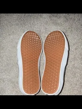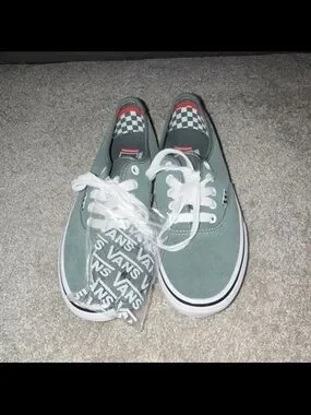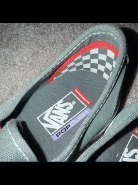 Low-top Vans with PopCush insole. Sage green canvas upper. Checkerboard tongue detail and red trim. White logo on footbed. Comfortable casual sneaker.