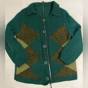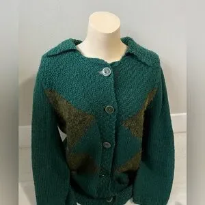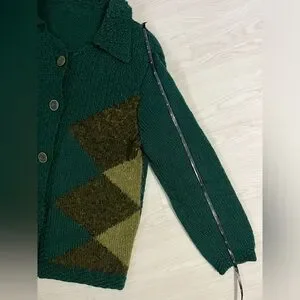 vintage textured knit cardigan sweater emerald green with argyle green pattern