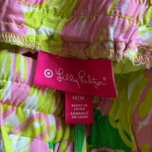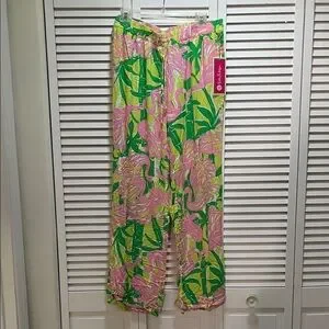 Bright floral print wide-leg pants by Lilly Pulitzer. Elastic waist with drawstring for comfort. Lightweight, breezy fabric ideal for warm days. Vibrant pink and green pattern with yellow accents.
