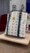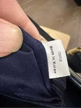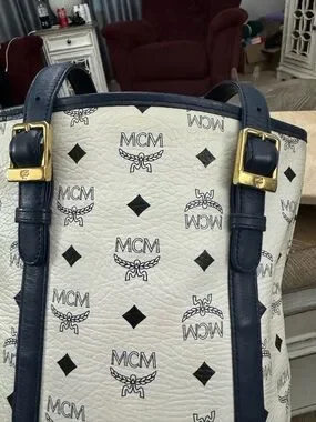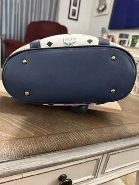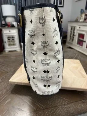 MCM White Leather Bucket Bag Logo Tote with Navy Leather Trim & Gold Plaque