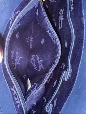 MCM bucket-style tote bag featuring the brand's signature Visetos monogram. The bag is crafted from white coated canvas with navy blue leather trim and straps, accented by gold-tone hardware.Key FeaturesDesign: White/Navy Blue Visetos monogram print on coated canvas.Hardware: 24k gold-plated logo plaque and buckle details on the handles.Style: Bucket-style tote with double flat top handles.