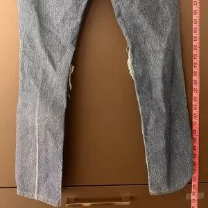 After Party Vintage is our limited edition collection of hard-to-find vintage, reimagined and reworked in Los Angeles. Size 27 Levi's jeans with rips on legs and knees. Straight leg. Great condition