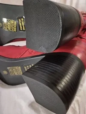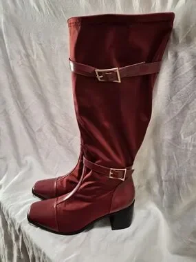 This modern riding boot is characterized by its square-toe design, double buckle accents, and a block heel that stands approximately 2.75 inches tall.
