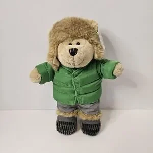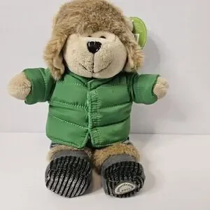 Starbucks 104th Edition Bearista Bear plush toy from 2011. It features a green puffer jacket, gray pants, and brown faux fur trapper hat with matching boots.