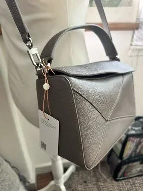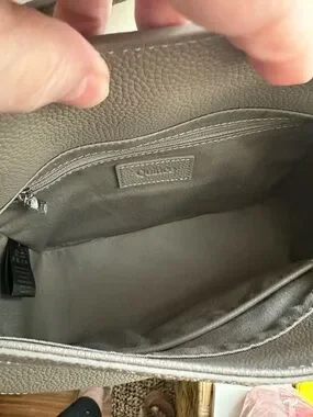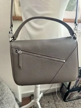 Structured pebbled 100% Italian leather crossbody with top handle. Detachable shoulder strap for versatile wear. Geometric patchwork stitched detailing on front. Zip pocket on back. Secure flap closure magnetic with clean lines. Interior zip and slip pocket. Silver hardware. Cotton twill lining. Neutral taupe complements many outfits. Comes with dust bag.
