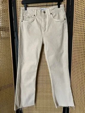 Zara high-rise jeans in a light cream shade. Five-pocket design with metal button and rivet accents. Clean, minimalist style for versatile wear.