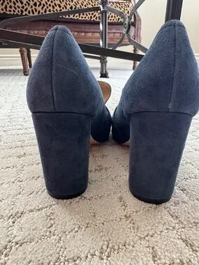 Classic navy suede loafers with a rounded buckle detail. Low heel and cushioned insole for all-day comfort. Elegant square toe and stitched vamp for refined style. Easy to pair with tailored or casual outfits.