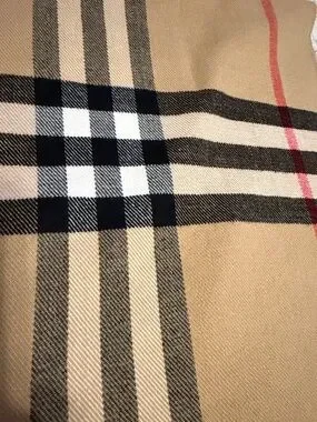 Soft tan scarf featuring bold black, white and red plaid stripes. Lightweight woven fabric with fringe ends. Stylish accessory that pairs with casual and dress looks.
