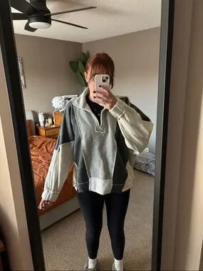 Aemi + Co relaxed-fit colorblock pullover sweater with a deep V-neck and dropped shoulders. Soft, cozy fabric in light gray and charcoal for everyday layering. Easy-to-style neutral tones that pair well with jeans or leggings.