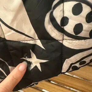 There was smal torn but already fixed it. Other than in great condition . The white area looks dirty but this exactly the print of the jacket.