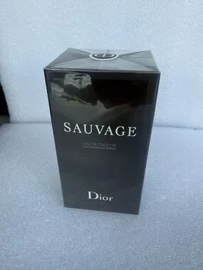 Dior Sauvage eau de toilette in glossy black box. Clean, bold branding on front. Classic designer fragrance presentation.