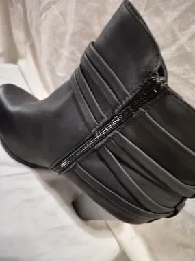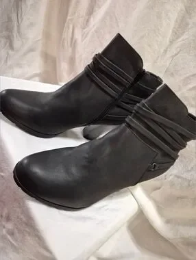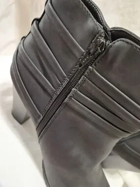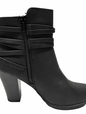 Faux-leather or fabric upper in a block heel bootie style with a round toe