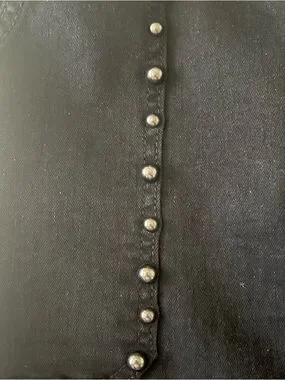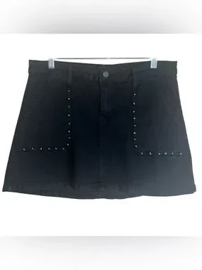 A chic black denim mini skirt with studded pocket trim for an edgy finish. High-rise silhouette flatters the waist and creates a streamlined look. Durable denim construction for everyday wear. Pair with tees or blouses for versatile